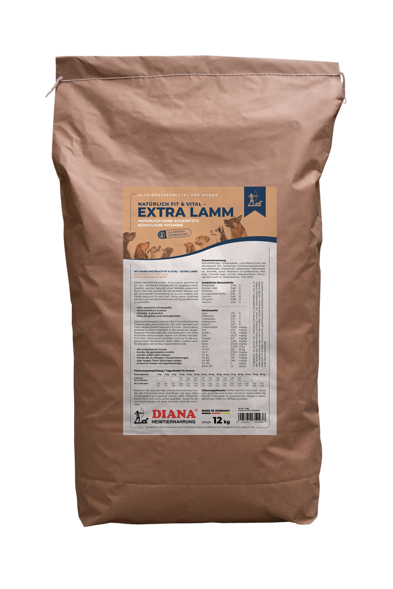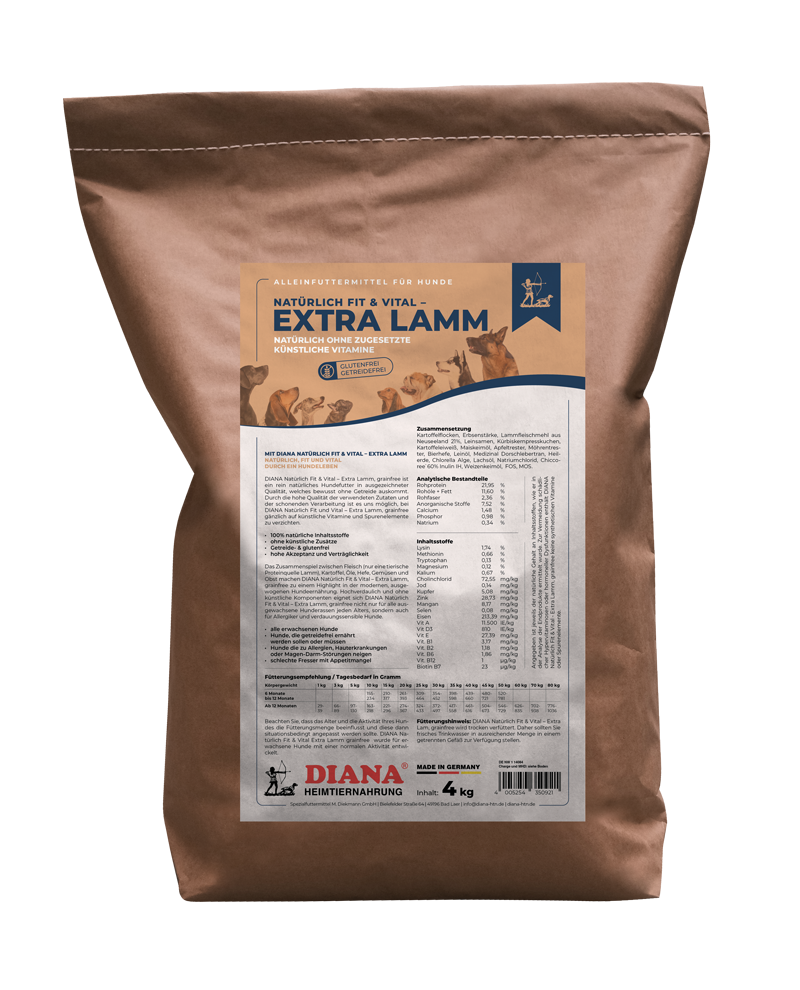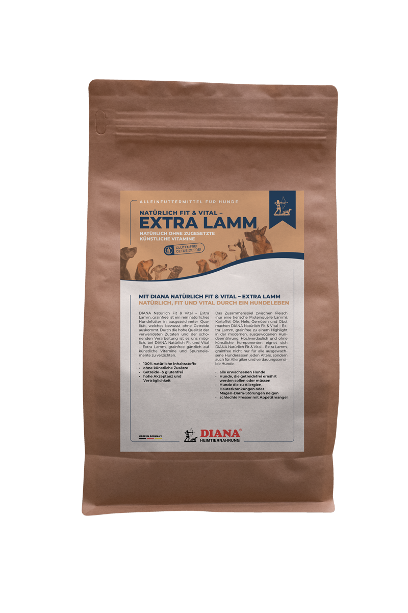 DIANA Natürlich Fit & Vital – Extra Lamm, grainfree ist ein rein natürliches Hundefutter in ausgezeichneter Qualität, welches bewusst ohne Getreide auskommt. Durch die hohe Qualität der verwendeten Zutaten und der schonenden Verarbeitung ist es uns möglich, bei DIANA Natürlich Fit und Vital – Extra Lamm, grainfree gänzlich auf künstliche Vitamine und Spurenelemente zu verzichten.