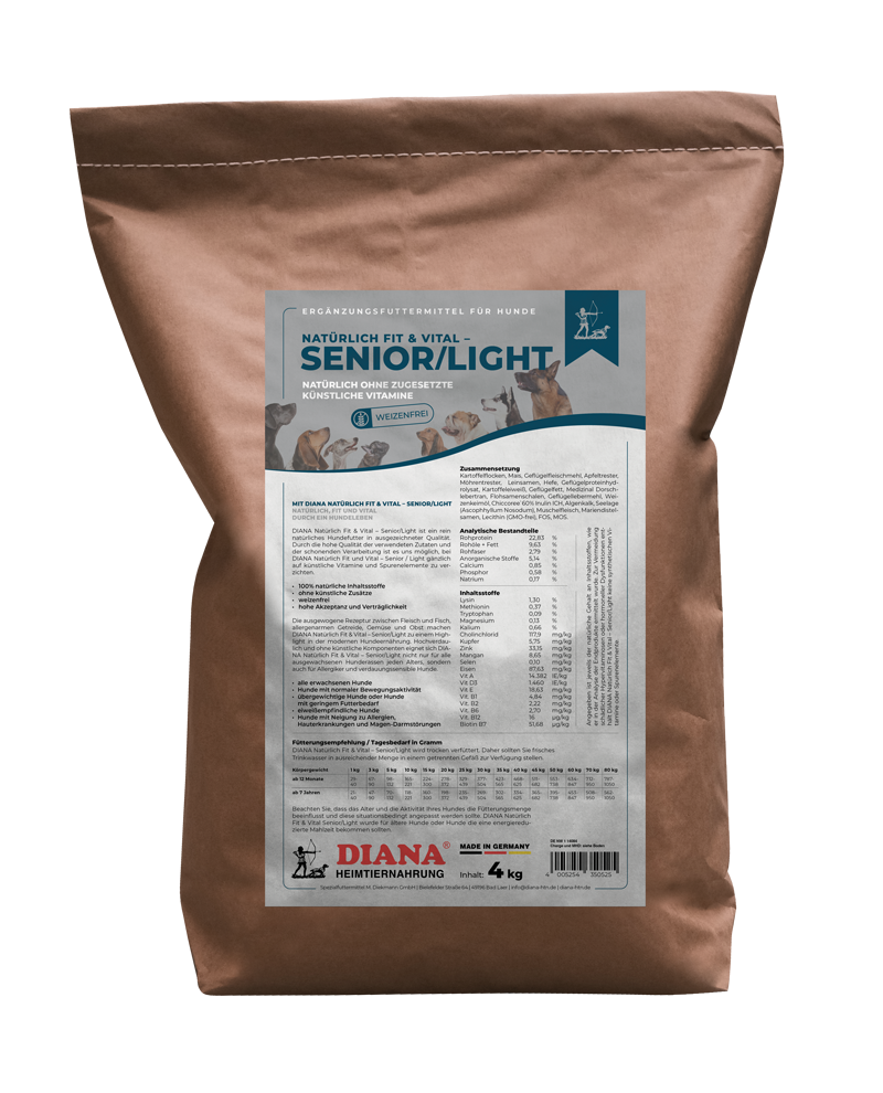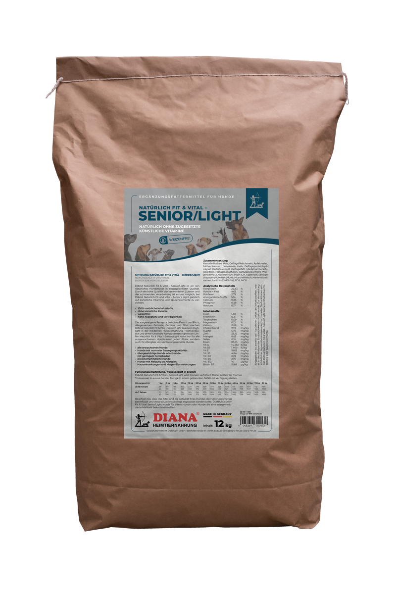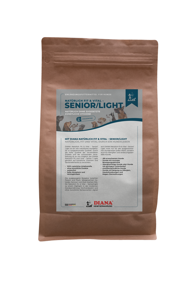 DIANA Natürlich Fit & Vital – Senior / Light ist ein rein natürliches Hundefutter in ausgezeichneter Qualität. Durch die hohe Qualität der verwendeten Zutaten und der schonenden Verarbeitung ist es uns möglich, bei DIANA Natürlich Fit und Vital – Senior / Light gänzlich auf künstliche Vitamine und Spurenelemente zu verzichten