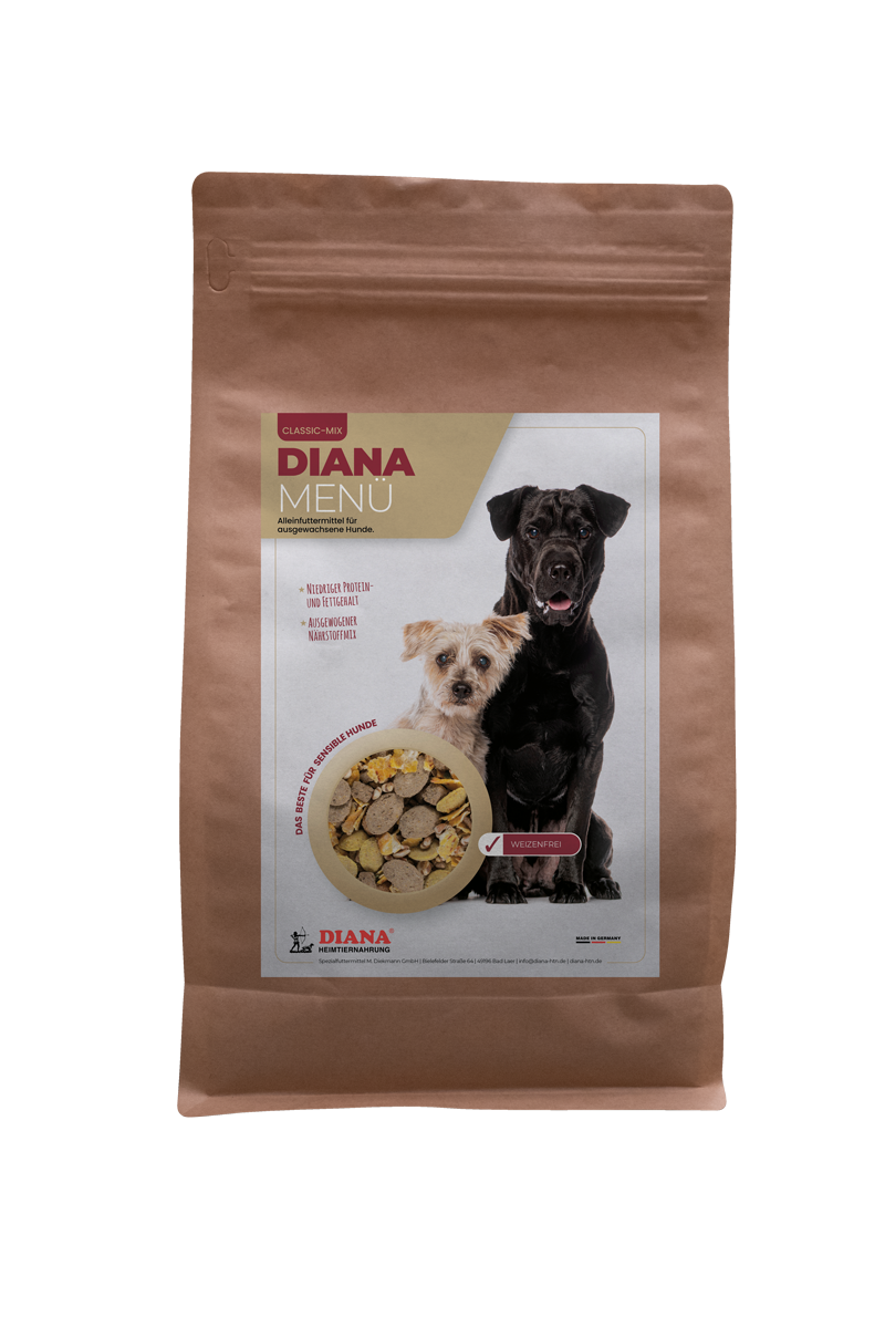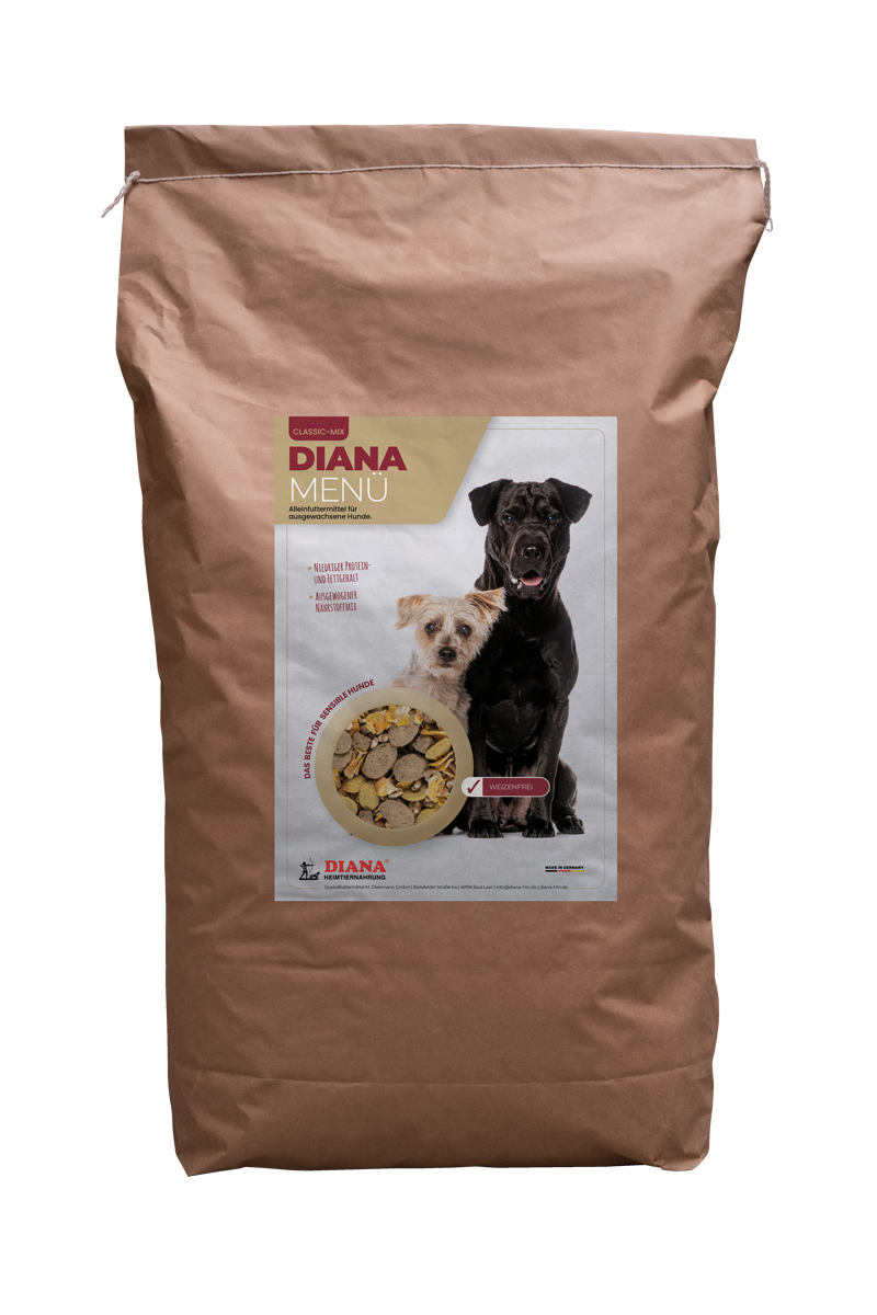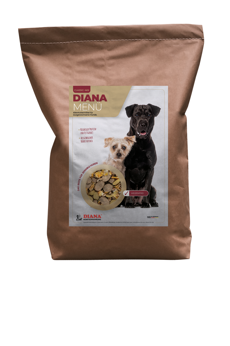 DIANA Menü ist für alle erwachsenen Hunde mit normaler Aktivität. Unbedingt Alter und Aktivität des Hundes beachten und die Futterration anpassen.